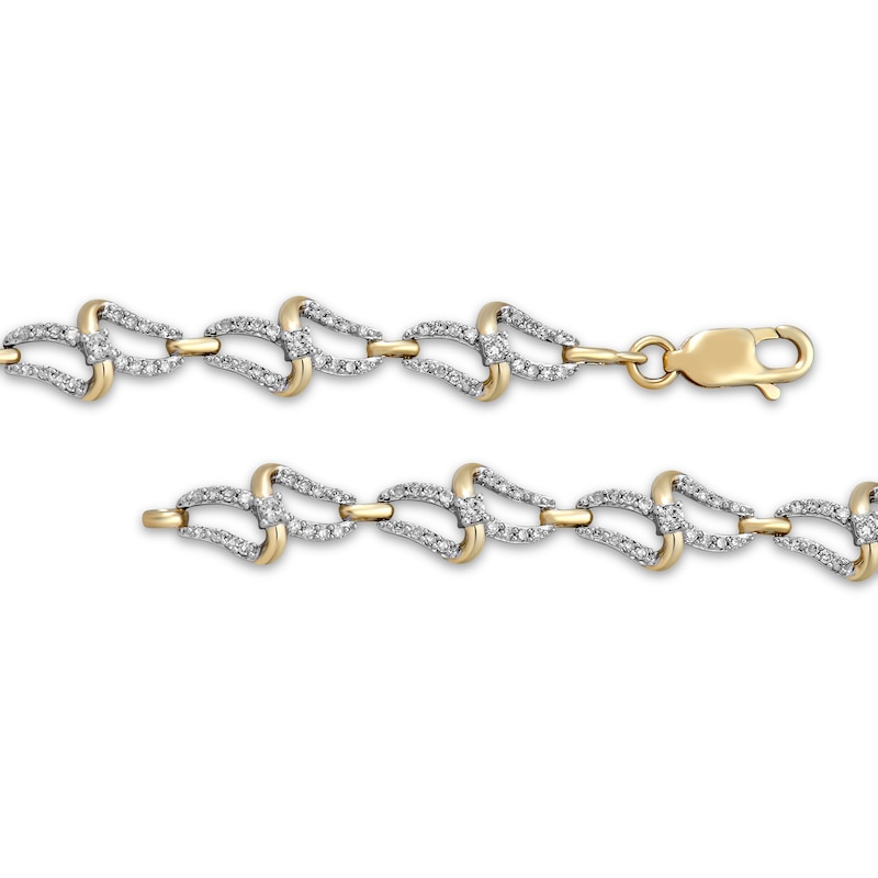 Wrap her wrist in the dainty look of this diamond link bracelet. Crafted in 10K yellow gold with white rhodium accents, this open artistic design features round diamond-lined links with polished gold bypass ribbons. With a total diamond weight of 1 carat, this 7.25-inch bracelet secures with a lobster clasp.