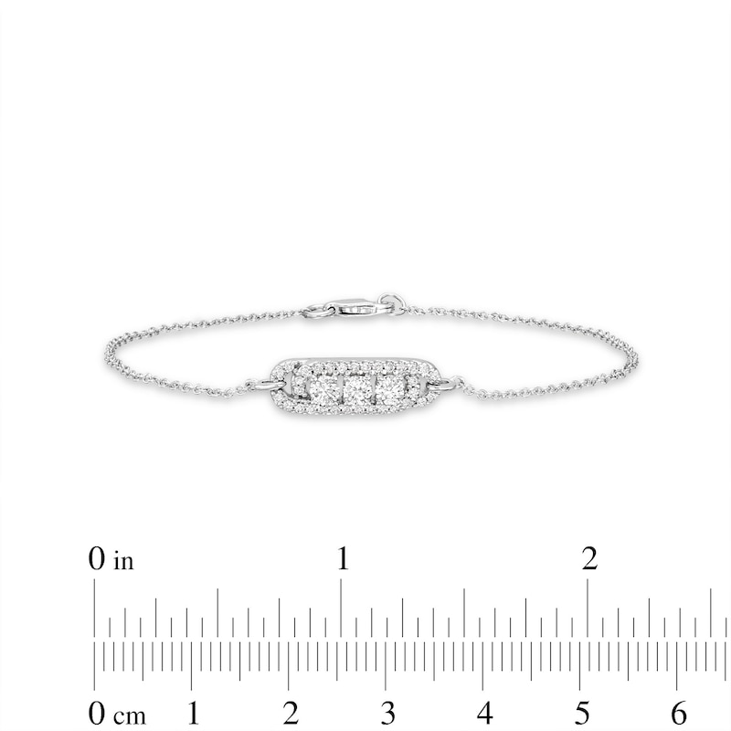 This charming bracelet displays a trio of brilliant round-cut diamonds surrounded by interlocking rows of dainty round diamonds. Fashioned in 10K white gold, the bracelet has a total diamond weight of 1/2 carat. The 7-inch cable chain secures with a lobster clasp.