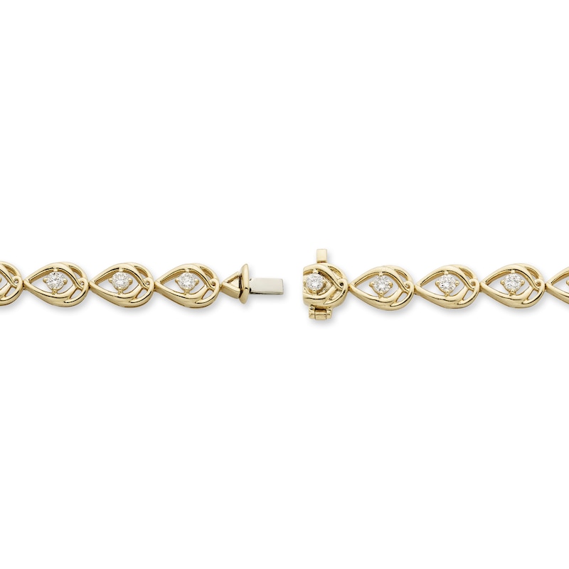 This exquisite bracelet from the Love Entwined collection features an interlinking design, representing your lives entwined by love. Twinkling round-cut diamonds add beautiful sparkle and give the 10K yellow gold design a total diamond weight of 1 carat. The bracelet measures 7 inches and secures with a box clasp. Exclusively at KAY.