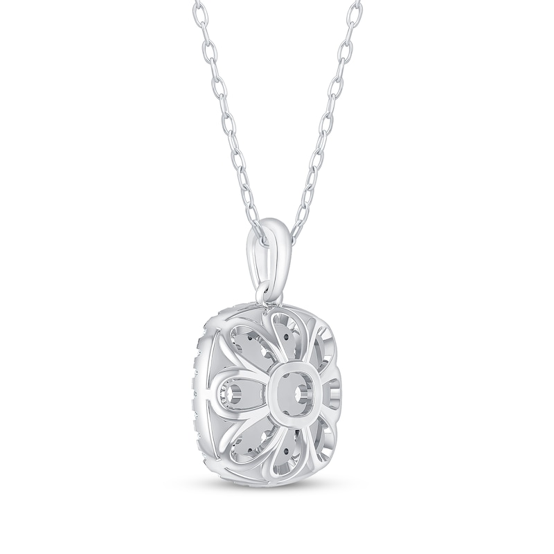 An unforgettable classic, this beautiful necklace sparkles with 1 carat total weight in diamonds. The cushion-shaped pendant is crafted in classic 10K white gold and embellished with brilliant round diamonds. The pendant hangs from an 18-inch cable chain and secures with a spring ring clasp.