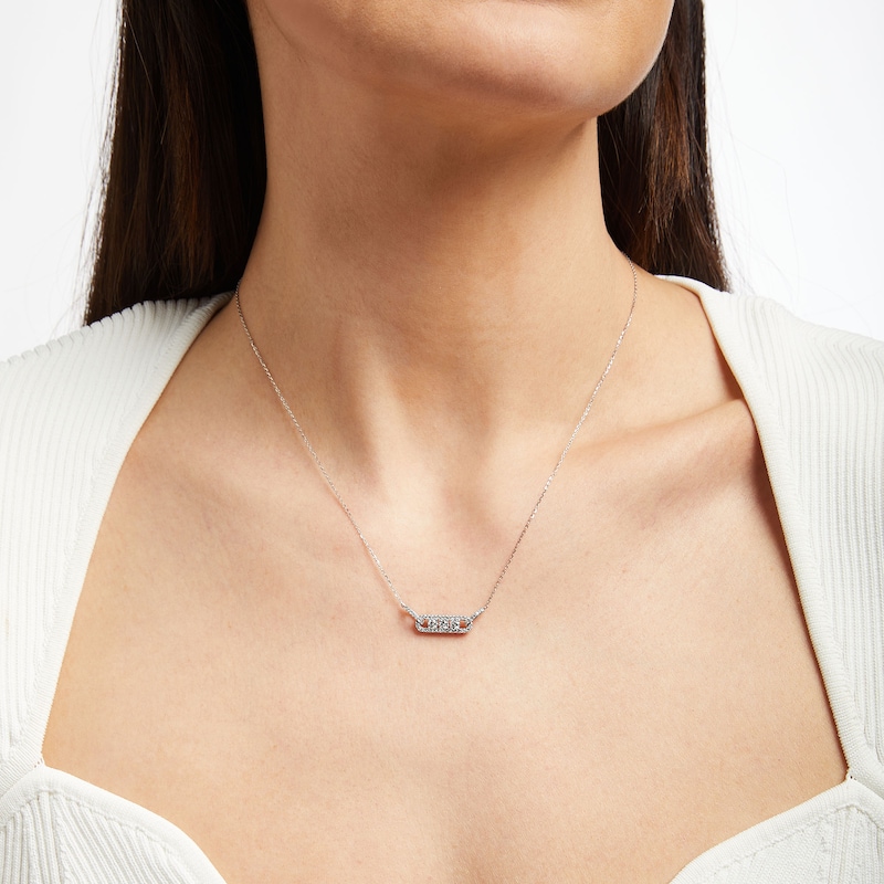 A horizontal trio of sparkling round diamonds adorns this lovely necklace styled in 10K white gold. Shimmering round diamonds trace a frame around the design, giving the necklace a total diamond weight of 1/2 carat. The pendant suspends from an adjustable 18-inch cable chain that secures with a spring ring clasp.