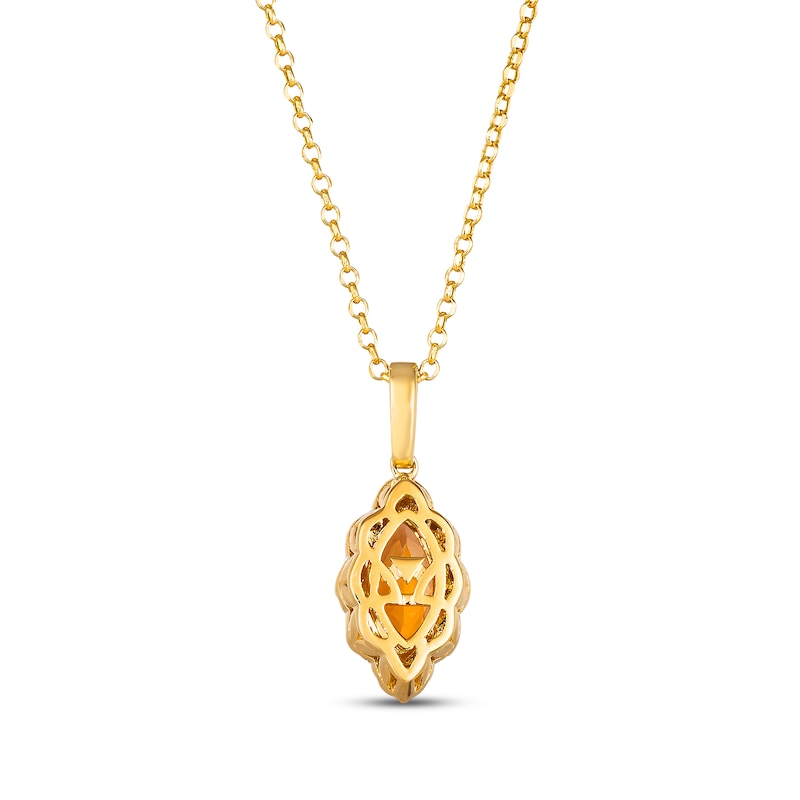Amp up the glow with this shimmering necklace from Le Vian®. Crafted in 14K Honey Gold™, this dainty drop showcases a marquise-cut Cinnamon Citrine® wrapped in a scalloped frame of round-cut Nude Diamonds™. Above, the bail sparkles with Chocolate Diamonds® in black rhodium for a total diamond weight of 3/8 carat. The pendant suspends along an adjustable rolo chain with jump rings at the 17, 18 and 19-inch positions and it secures with a lobster clasp.