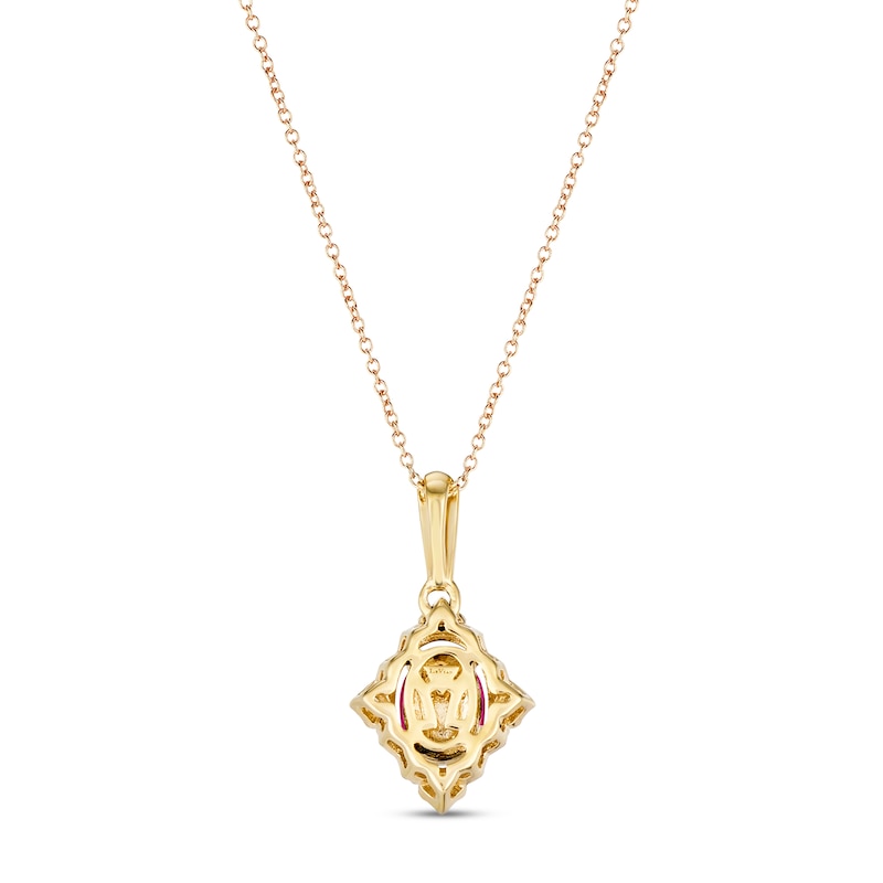 This magnificent necklace from Le Vian® showcases a highly selective oval-cut Raspberry Rhodolite®. The splendid gemstone is perfectly perched amidst a frame of Chocolate Diamonds® and Nude Diamonds™. The masterful combination of rich flavors is fashioned in 14K Honey Gold™. With a total diamond weight of 1/6 carat, the pendant suspends from an 18-inch cable chain and secures with a lobster clasp. Le Vian®. Discover the Legend.