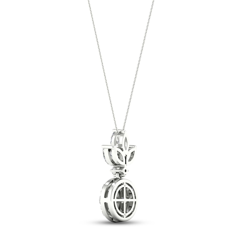This enchanting necklace features a circular pendant that shimmers with radiant round and pear-shaped diamonds, which dangles below of a glamorous trio of marquise-cut diamonds. Fashioned in 14K white gold, the necklace has a total diamond weight of 2 carats. The pendant sways from an 18-inch cable chain that secures with a lobster clasp.