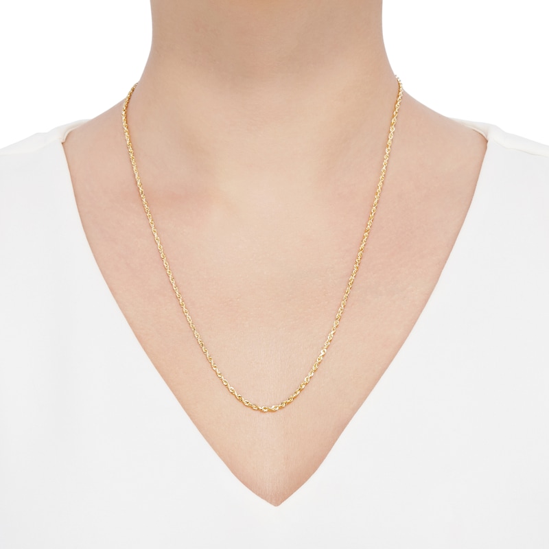 Always a classic and perfect for everyday wear, this rope chain is crafted in solid 14K yellow gold. The 22-inch chain measures between 2.4mm and secures with a lobster clasp.