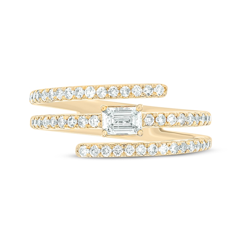 Modern and chic, this faux-stack ring radiates style. An emerald-cut diamond gleams at the center of the 14K yellow gold band, while dainty round-cut diamonds line the three-row design. The ring has a total diamond weight of 7/8 carat.