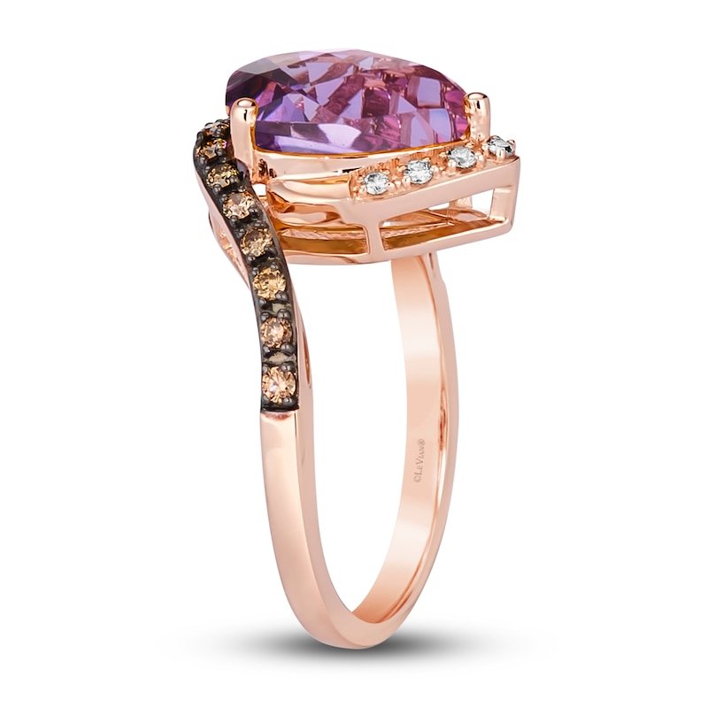 A succulent pear-shaped Grape Amethyst™ is perfectly placed amidst swirling ribbons frosted with Nude Diamonds™ and Chocolate Diamonds®. Styled in delicious 14K Strawberry Gold®, the ring has a total diamond weight of 1/4 carat. Le Vian®. Discover the Legend. This ring is available in limited sizes. If you don't see your size here, please visit a store to order your ring.