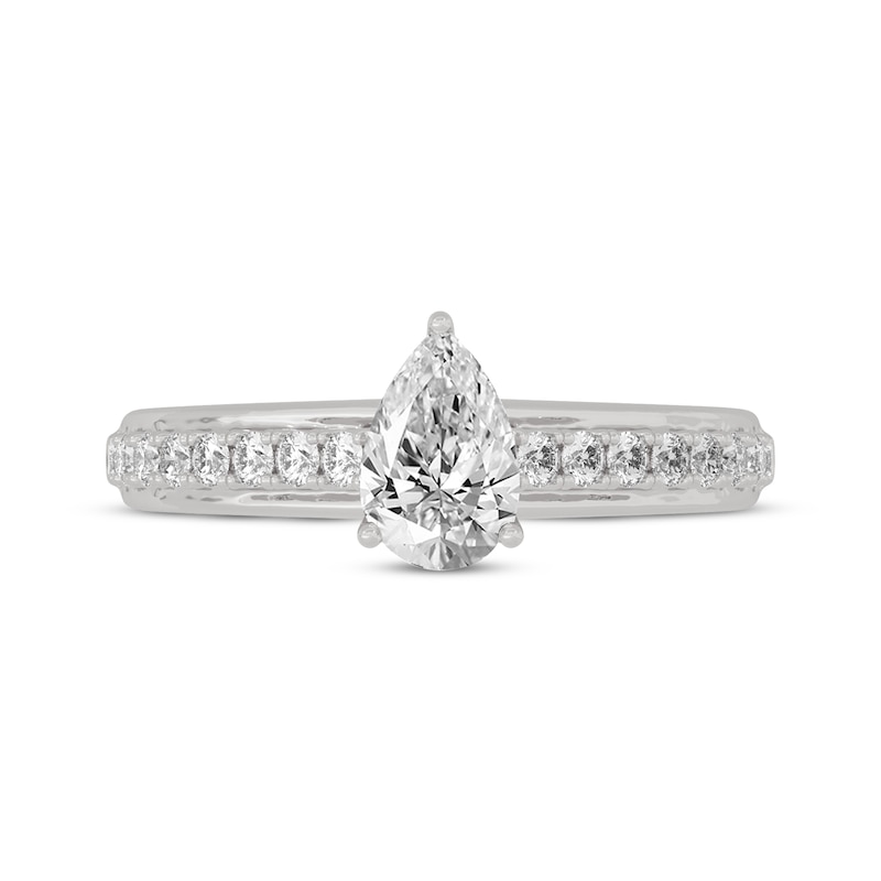 Celebrate your engagement with this delightful ring. Crafted in 14K white gold, this design showcases a shimmering 1/2-carat pear-shaped diamond solitaire that sparkles atop a sculpted shank lined with round-cut diamonds for a total diamond weight of 3/4 carat. From the Now & Forever® bridal collection.