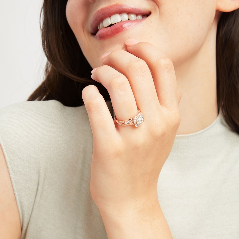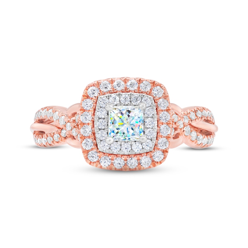 This breathtaking engagement ring showcases a 1/3-carat princess-cut First Light® diamond framed by round diamonds and styled in 14K white gold. More round diamonds trace the silhouette and shimmer down the elegantly interwoven band, styled in 14K rose gold. The independently certified diamonds have a total diamond weight of 3/4 carat. The center diamond is laser-inscribed with a unique Gemscribe® serial number to ensure your peace of mind.