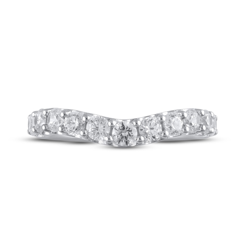 A sparkling array of round lab-created diamonds adorn the unique contour of this lovely anniversary ring for her. Crafted in 14K white gold, the ring has a total lab-created diamond weight of 1 carat. From the Lab-Created Diamonds by KAY collection.