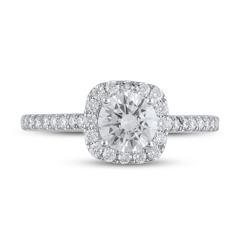 This stunning engagement ring features a beautiful 1-carat round, independently-certified, lab-created diamond at its center, haloed and flanked by more shimmering round-cut lab-created diamonds. The total lab-created diamond weight is 1 1/4 carats in this gorgeous 14K white gold ring. From the Lab-Created Diamonds by KAY collection.