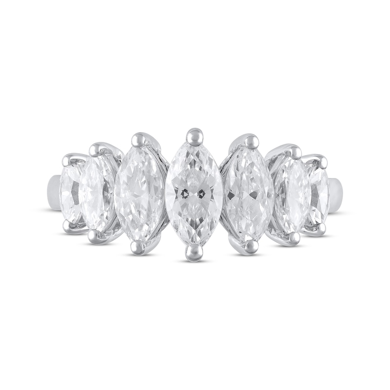 - Seven independently certified marquise-cut lab-created diamonds graduate in size toward the center