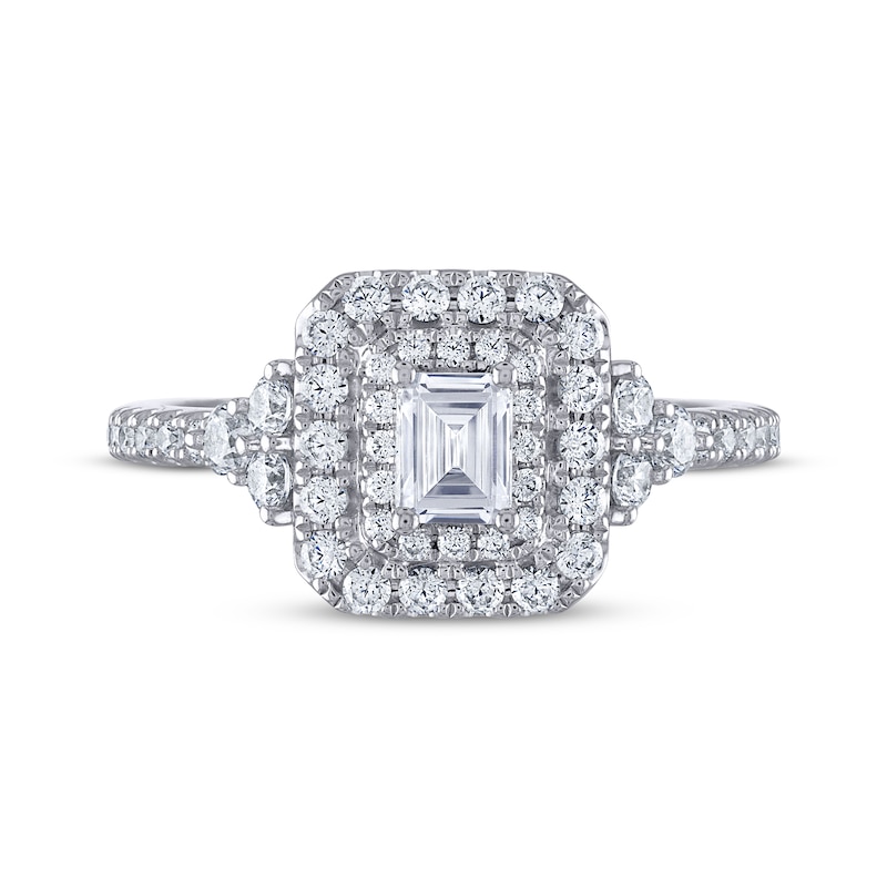 - Centering the style, a 1/3-carat emerald-cut lab-created diamond shines in a double frame of round-cut lab-created diamonds