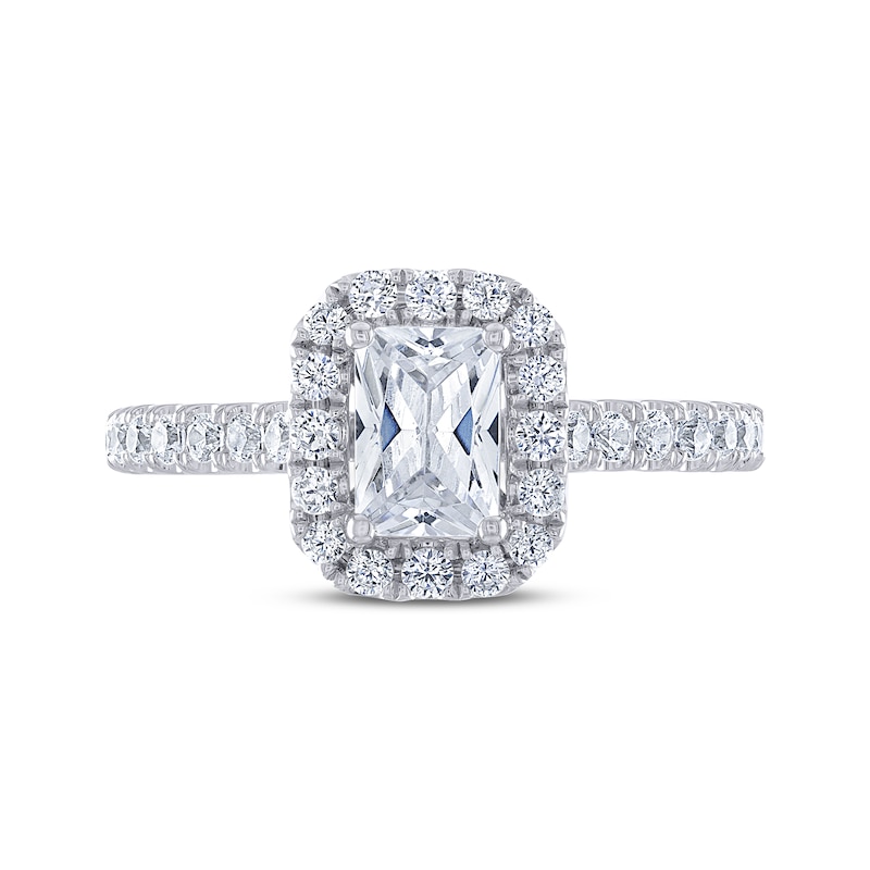 Celebrate your love with THE LEO® Legacy Lab-Created Diamond, featuring additional facets that are strategically placed to maximize the return of light and create faraway sparkle. Crafted in 14K white gold, this engagement ring showcases a glamorous 1-carat emerald-cut lab-created diamond, laser-inscribed with a unique Gemscribe® serial number to ensure your peace of mind. A halo frame of independently certified round-cut lab-created diamonds wraps the centerpiece, and more decorate the band. The ring has a total lab-created diamond weight of 1 3/8 carats.