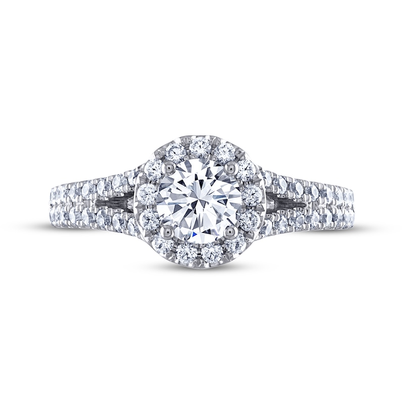 Celebrate your love with THE LEO Legacy Lab-Created Diamond, which features additional facets that are strategically placed onto the lab-created diamond, maximizing the return of light and creating faraway sparkle. This exquisite engagement ring showcases a radiant 3/4-carat round lab-created diamond as the focal point. Shimmering round lab-created diamonds halo the center and dance down the split-shank band. The ring is crafted in 14K white gold and has a total lab-created diamond weight of 1 1/6 carats. The center lab-created diamond is independently certified and laser-inscribed with a unique Gemscribe® serial number to ensure your peace of mind.