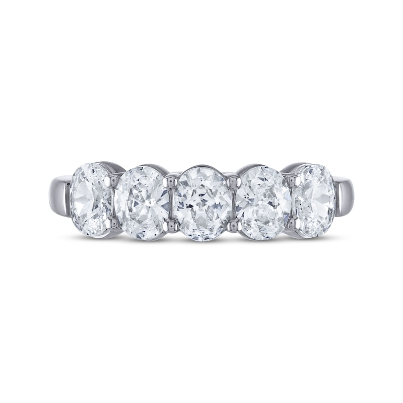 - Five luminous 3/8-carat oval-cut lab-created diamonds line up on the band