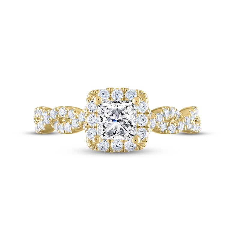 Introducing THE LEO® Legacy Lab-Created Diamond, which features additional facets that are strategically placed onto the lab-created diamond, maximizing the return of light and creating far away sparkle. A dazzling 3/4-carat princess-cut lab-created diamond is the focal point of this gorgeous engagement ring for her. Radiant round lab-created diamonds frame the center and sweep along the ornately twisted 14K yellow gold band. The ring has a total lab-created diamond weight of 1 1/6 carats. The central lab-created diamond is independently certified and laser-inscribed with a unique Gemscribe® serial number.