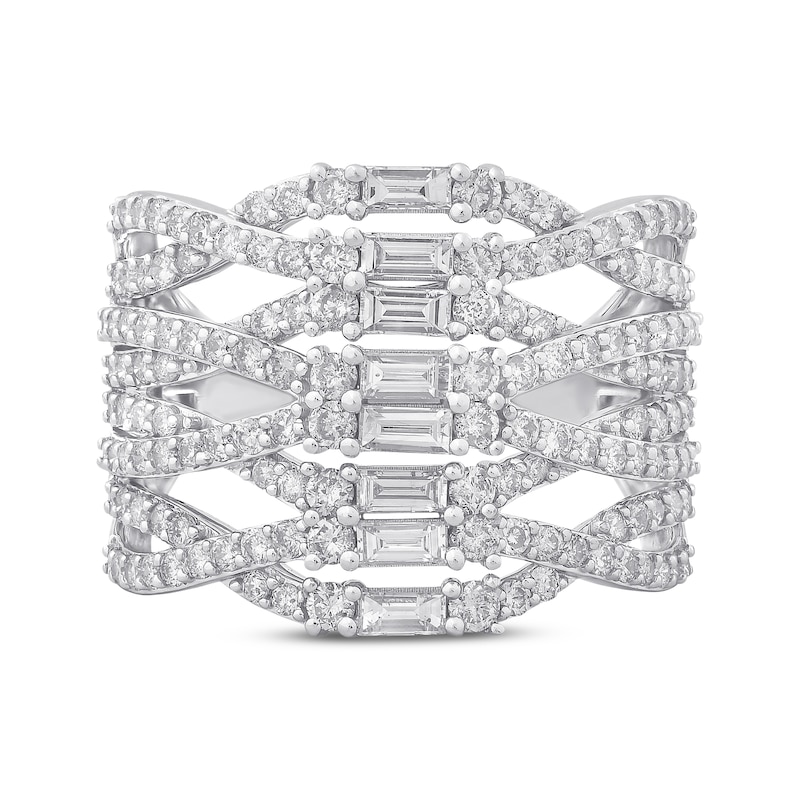Create a sensation with this stunning diamond ring. Crafted in 10K white gold, this stacked design features baguette-cut diamonds flanked by round diamonds along the center. Diamond-lined crossover ribbons create the wide and open shank. This dramatic ring has a total diamond weight of 2 carats.