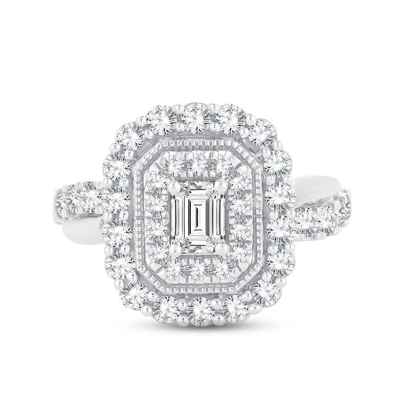 This captivating engagement ring showcases a dazzling 2/5-carat emerald-cut diamond. A double-halo of brilliant round diamonds surrounds the center, and additional round diamonds shimmer along the twisting band. Styled in lustrous 14K white gold with a rhodium finish, the ring has a total diamond weight of 1 1/2 carats. From the Now and Forever® bridal collection.