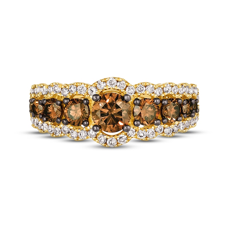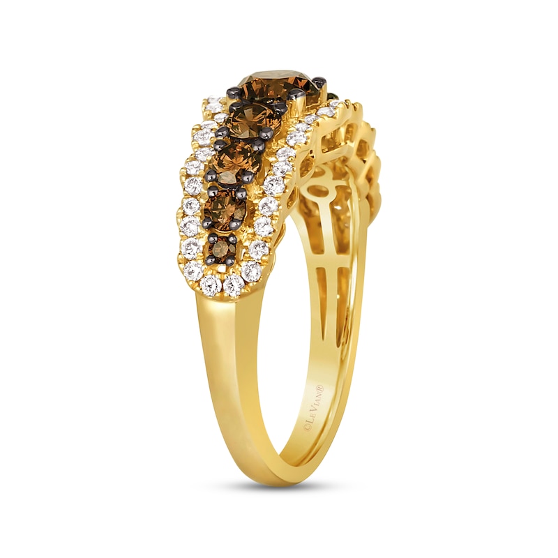 This exceptional Le Vian® ring from the KAY exclusive Chocolate Waterfall™ collection is crafted in sweet 14K Honey Gold™ and showcases a center row of stunningly rich Chocolate Diamonds®. Dainty rows of Nude Diamonds™ trace the scalloped edges of the band, giving the ring a total diamond weight of 1 1/2 carats. Le Vian®. Discover the Legend. This ring is available in limited sizes. If you don't see your size here, please visit a store to order your ring.
