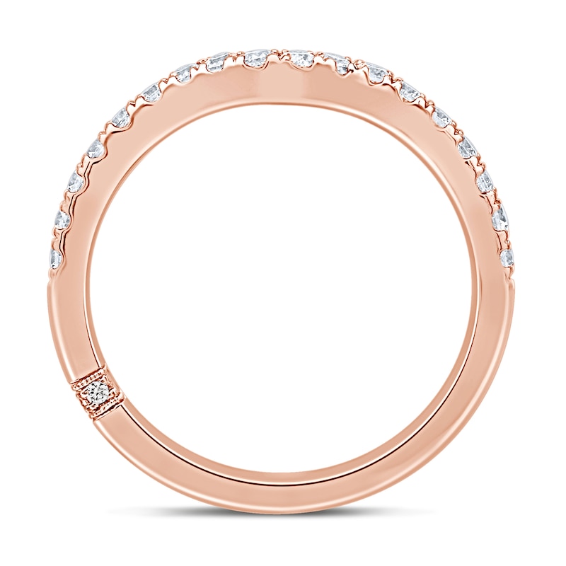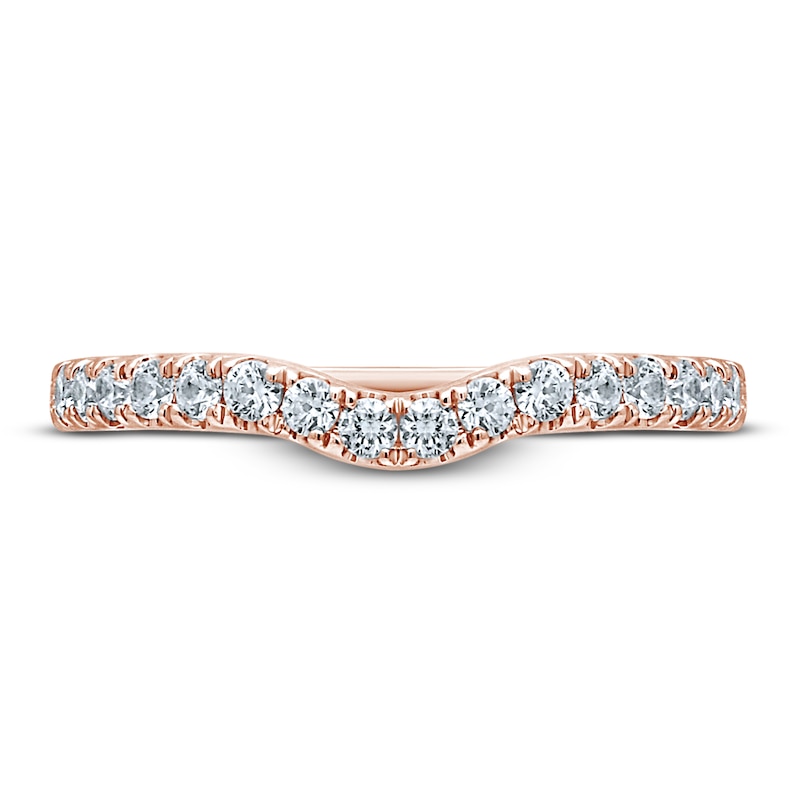 This beautiful wedding band features a contoured design set in dreamy 18K rose gold and complements her matching engagement ring (sold separately). Brilliant round independently-certified diamonds line the band for a total diamond weight of 3/8 carat. From the Monique Lhuillier Bliss collection, available exclusively at KAY. Please note: This ring is available in limited sizes. If you don't see your size here, please visit a store to order your ring.