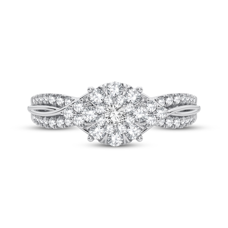 This radiant engagement ring showcases a sparkling array of round-cut diamonds that glimmer on the composite center. More round diamonds twinkle on the flanks and sweep down the elegantly twisted band. The ring is crafted in cool 10K white gold and has a total diamond weight of 3/8 carat. From the Now & Forever® bridal collection.