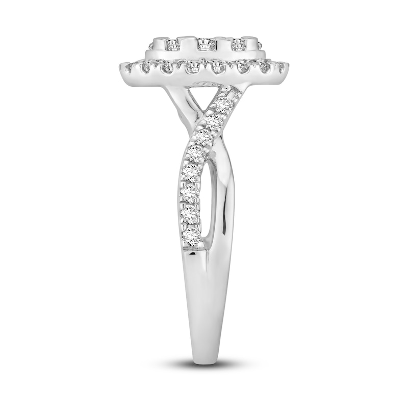 This gorgeous diamond engagement ring showcases an oval-shaped multi-diamond center, haloed by round-cut diamonds. More round diamonds weave down the twisted band for a total diamond weight of 1 carat. The ring is set in iconic 14K white gold. From the Now & Forever® bridal collection.