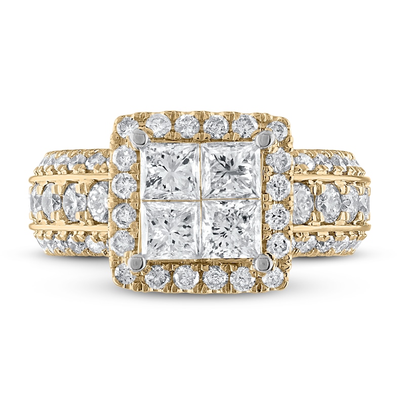 A quartet of stunning princess-cut diamonds make up the center of this gorgeous engagement ring for her. Sparkling round diamonds frame the center and down each side of the band in three rows. The ring is fashioned in classic 14K yellow gold and boasts a total diamond weight of 3 carats. From the Now & Forever® bridal collection.