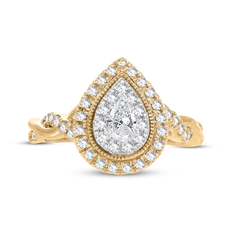 This beautiful engagement emits a chorus of sparkle. Showcased at the center is a bright pear-shaped diamond wrapped by two halos of radiant round-cut diamonds. Additional round diamonds dance down the twisting sides of the 14K yellow gold setting with milgrain detailing. The ring has a total diamond weight of 5/8 carat and is featured in our Now & Forever® bridal collection.