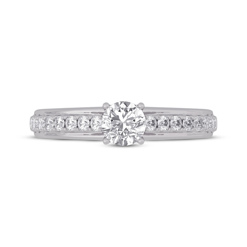 Celebrate your engagement with this delightful ring. Crafted in 14K white gold, this design showcases a shimmering 1/2-carat round-cut diamond solitaire that sparkles atop a sculpted shank lined with smaller round-cut diamonds for a total diamond weight of 3/4 carat. From the Now & Forever® bridal collection.