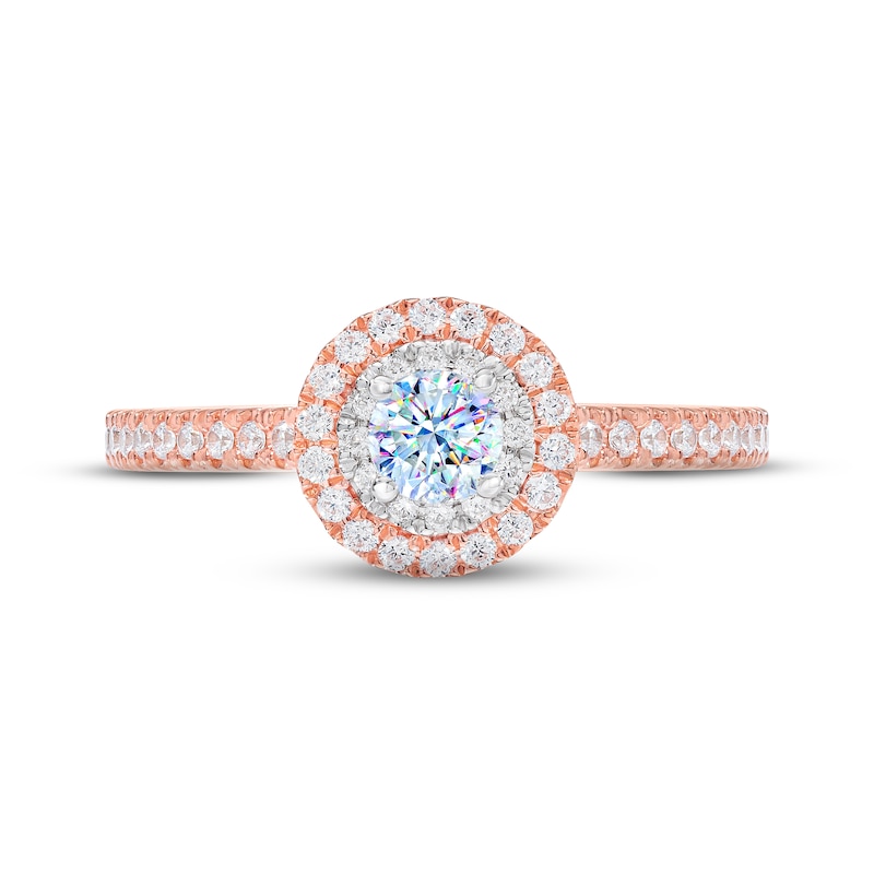 This dreamy engagement ring features a 1/4-carat First Light® diamond that enchants from within a shimmering halo of round diamonds styled in 14K white gold. More round diamonds form an outer halo and grace the band, styled in 14K rose gold for a lovely two-tone contrast. The independently certified diamonds have a total diamond weight of 1/2 carat. The center diamond is laser-inscribed with a unique Gemscribe® serial number to ensure your peace of mind.