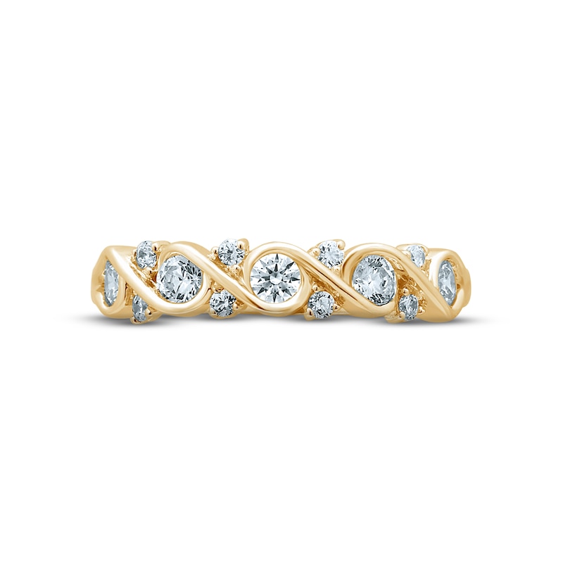 Gleaming swirls of 14K yellow gold wrap around luminous round-cut diamonds in this resplendent anniversary ring for her. Dainty round diamonds add extra sparkle and give the ring a total diamond weight of 1/2 carat. From the Now and Forever® bridal collection.