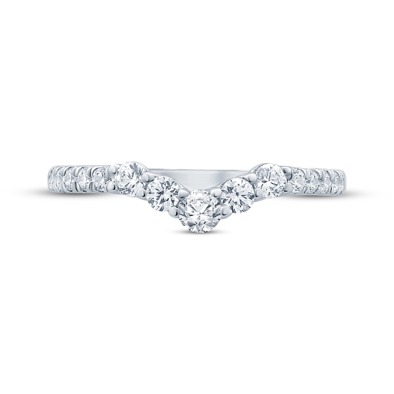 Glimmering with a bright chevron of round-cut diamonds at the center, this gorgeous anniversary band is perfect for your special occasion. More round-cut diamonds adorn the sides of the band, which is styled in cool 14K white gold with a rhodium finish. The diamonds total 1/2 carat in weight. From the Now & Forever® bridal collection.
