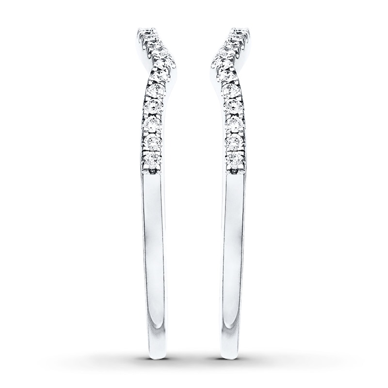 Glistening round diamonds adorn a curve of 14K white gold in each of these twin wedding bands for her. The bands are contoured to fit on each side of her matching engagement ring, sold separately. The bands have a total diamond weight of 1/4 carat.