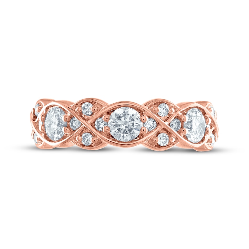 Celebrate this moment and every moment to come with diamonds for the memories you've shared and infinity designs for your endless love. This breathtaking diamond band reveals your affection. Fashioned in 14K rose gold, the sparkling look features crossover infinity symbols that weave around three 1/4-carat round-cut center diamonds and smaller round diamonds. This ornate style has a total diamond weight of 1 carat. A bezel-set round diamond and infinity symbol inside the shank is a signature of the Every Moment collection, exclusively at KAY.