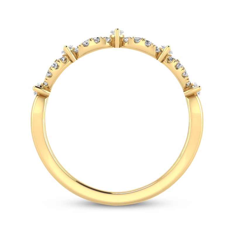 Your anniversary gift is sure to be loved with this sparkling diamond band. Shimmering marquise-shaped diamonds are separated by curved ribbons of round-cut diamonds. Crafted in 10K yellow gold, this regal look has a total diamond weight of 3/8 carat.