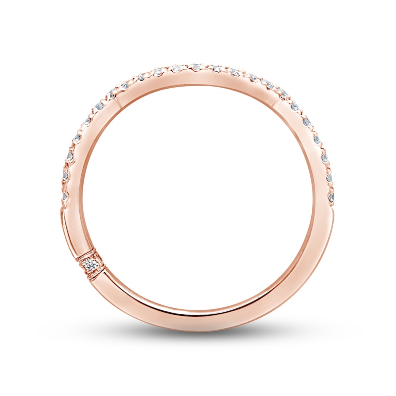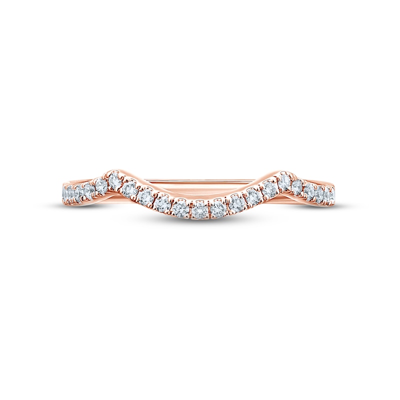 Scintillating independently-certified round diamonds dance along the contours of this romantic 18K rose gold wedding band. Crafted to pair with her matching engagement ring (sold separately), the band has a total diamond weight of 1/5 carat. From the Monique Lhuillier Bliss collection, available exclusively at KAY. Please note: This ring is available in limited sizes. If you don't see your size here, please visit a store to order your ring.