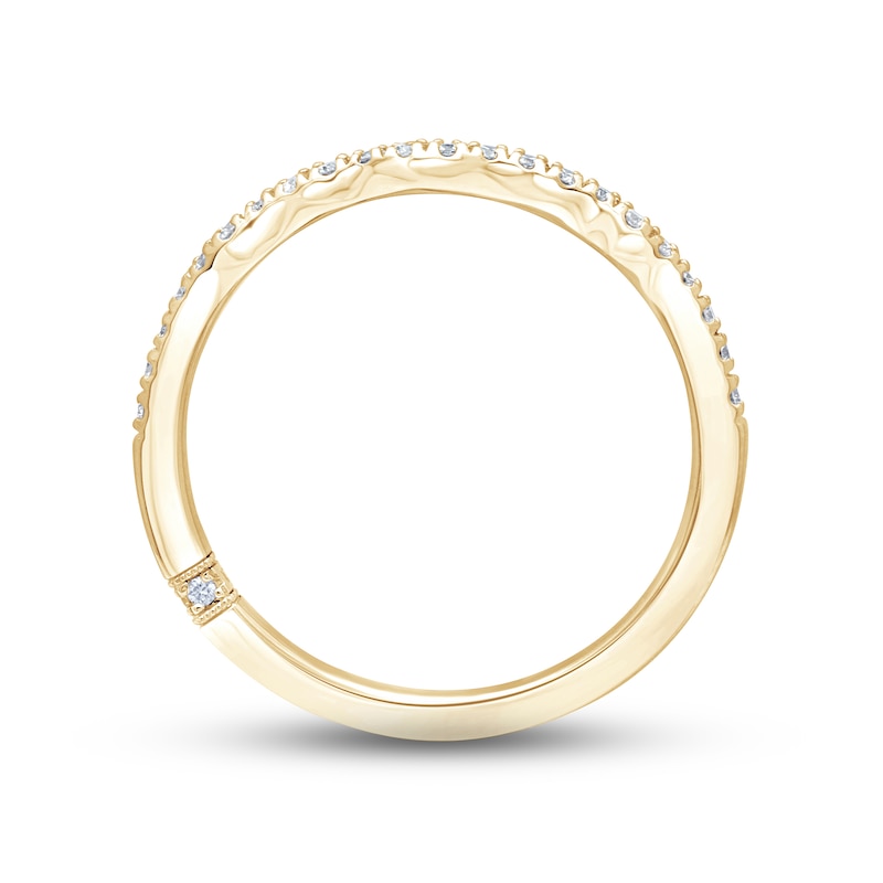 Brilliant independently-certified round diamonds sparkle along the gentle contours of this gleaming 18K yellow gold wedding band. Crafted to pair with her matching engagement ring (sold separately), the band has a total diamond weight of 1/5 carat. From the Monique Lhuillier Bliss collection, available exclusively at KAY. Please note: This ring is available in limited sizes. If you don't see your size here, please visit a store to order your ring