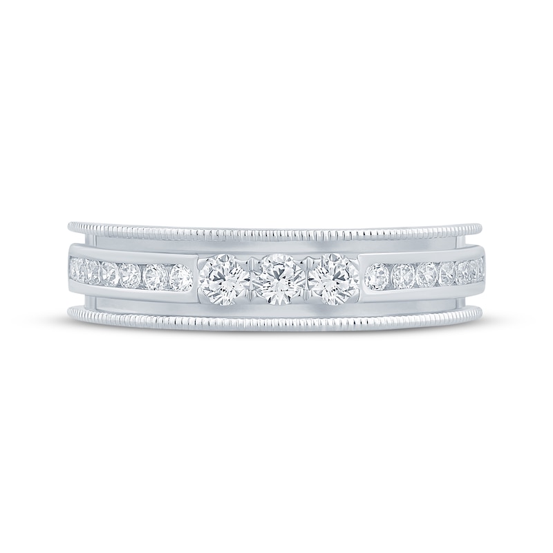 Present this vintage-inspired band to commemorate your years together. Crafted in 10K white gold, the milgrain-edged ring showcases a trio of round-cut diamonds at its center, flanked by channels of round-cut diamonds. The design has a total diamond weight of 1/3 carat. From the Now & Forever® bridal collection.