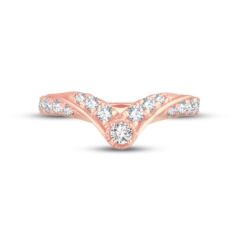 Romance her with this breathtaking anniversary ring, featuring a unique contoured design with a radiant round diamond at the center. More round diamonds twinkle on the 14K rose gold band for a total diamond weight of 5/8 carat. Milgrain accents finish the look. From the Now & Forever® bridal collection.