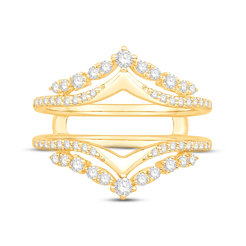 Bring out the best of your engagement ring (sold separately) with this stunning enhancer silhouette. Uniquely designed, the top and bottom are traced in two rows of shimmering round diamonds. With a beautiful high-polish finish, the 14K yellow gold ring has a total diamond weight of 1/2 carat. From the Now & Forever® bridal collection.