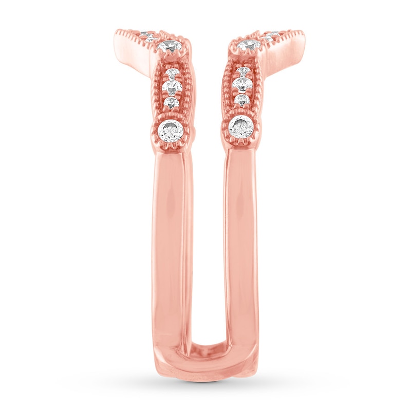 Milgrain beading and a subtly pointed band create a vintage-inspired design in this gorgeous enhancer ring for her. Round diamonds add beautiful sparkle to complete the look. Styled in 14K rose gold, the ring is designed to wrap around a diamond solitaire or engagement ring (sold separately). The diamonds total 1/4 carat in weight.