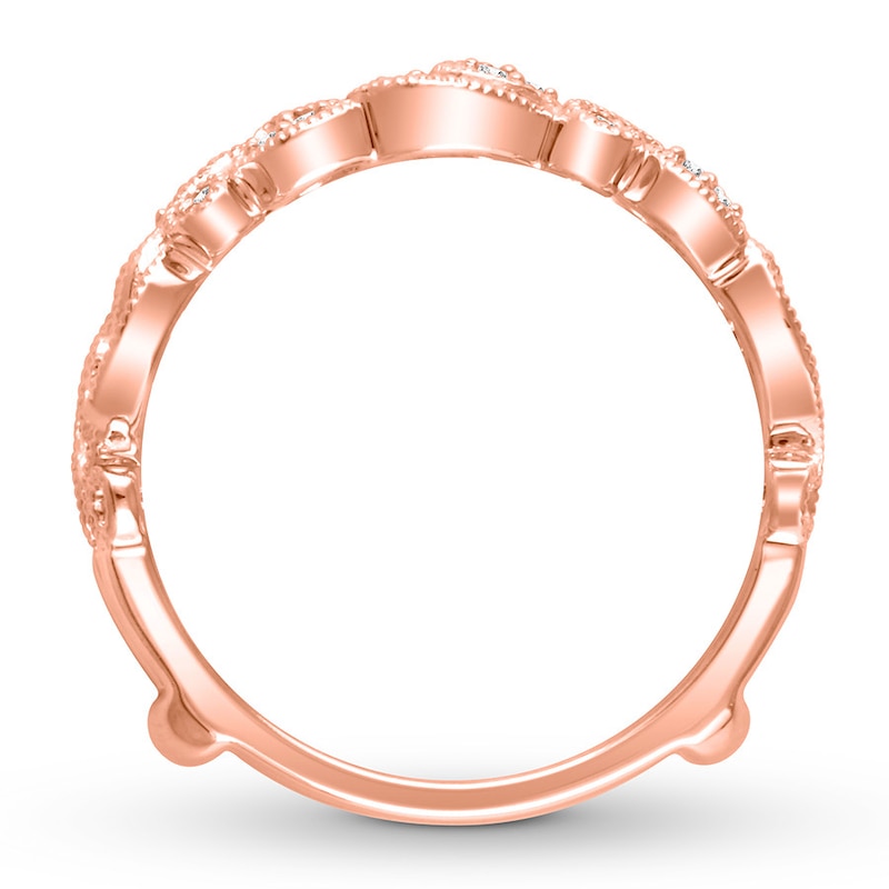 This diamond enhancer ring features a floral motif, beautifully fashioned in 14K rose gold with a sprinkling of round diamonds. The ring is positioned to complement your diamond solitaire ring (sold separately) and has a total diamond weight of 1/6 carat.