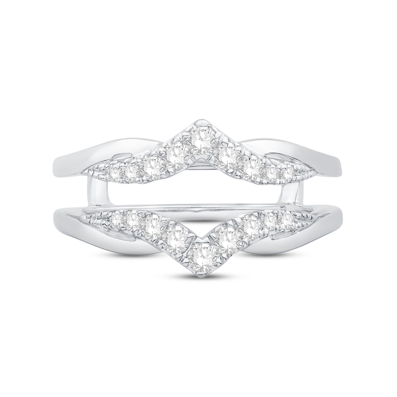 This exquisite enhancer ring showcases chevrons of shining round diamonds that twinkle above and below the space for her engagement ring (sold separately). The ring is styled in 14K white gold and has a total diamond weight of 3/8 carat. From the Now & Forever® bridal collection.