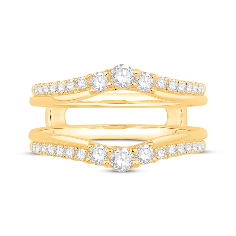 Step up your solitaire with this diamond wrap ring. Created in 14K yellow gold, this stylish enhancer lines her engagement ring (sold separately) with trios of round diamonds at the center, while smaller diamonds line the polished shank. This sleek enhancer has a total diamond weight of 5/8 carat. From the Now & Forever® bridal collection.