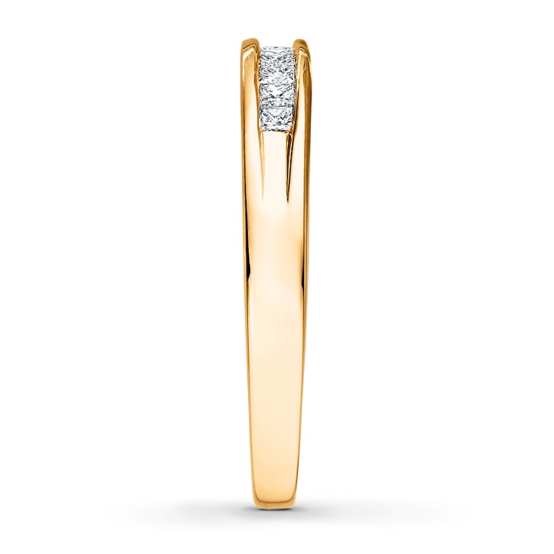 Princess-cut diamonds totaling 1/4 carat in weight dance along the 14K yellow gold band of this glistening wedding band.
