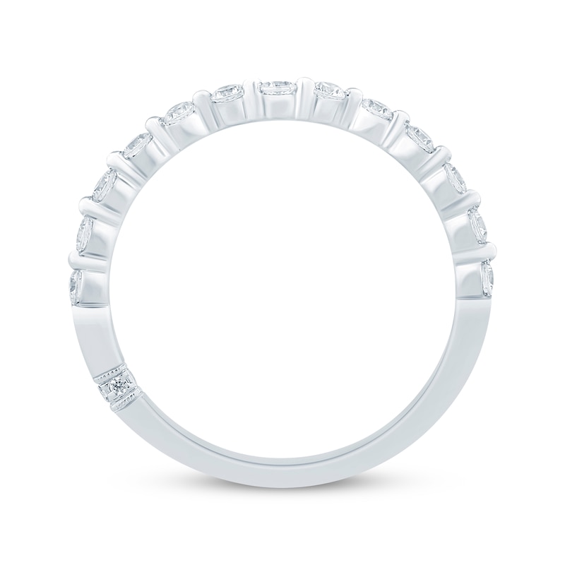 Seal your vows with the lovely shimmer of this diamond wedding band. Styled in 14K white gold, round-cut diamonds sparkle along the sculpted design. Contoured to pair with her matching engagement ring (sold separately), the band has a total diamond weight of 1/3 carat. A signature element of diamonds in milgrain detailing encircles the band, symbolizing unity and eternal love. From the Monique Lhuillier Bliss collection, available exclusively at KAY. Please note: This ring is available in limited sizes. If you don't see your size here, please visit a store to order your ring.