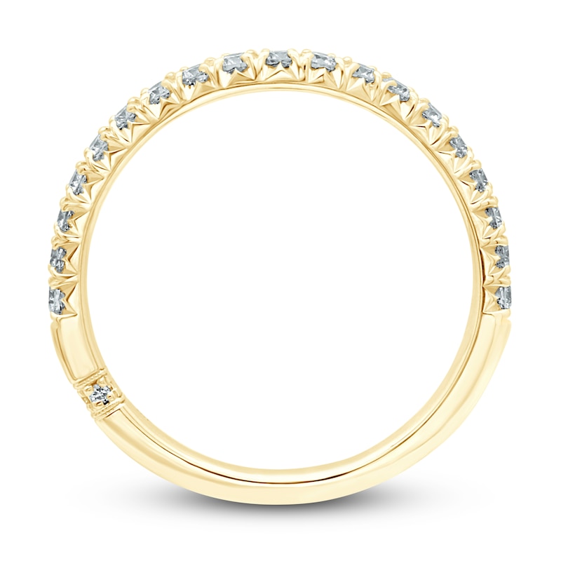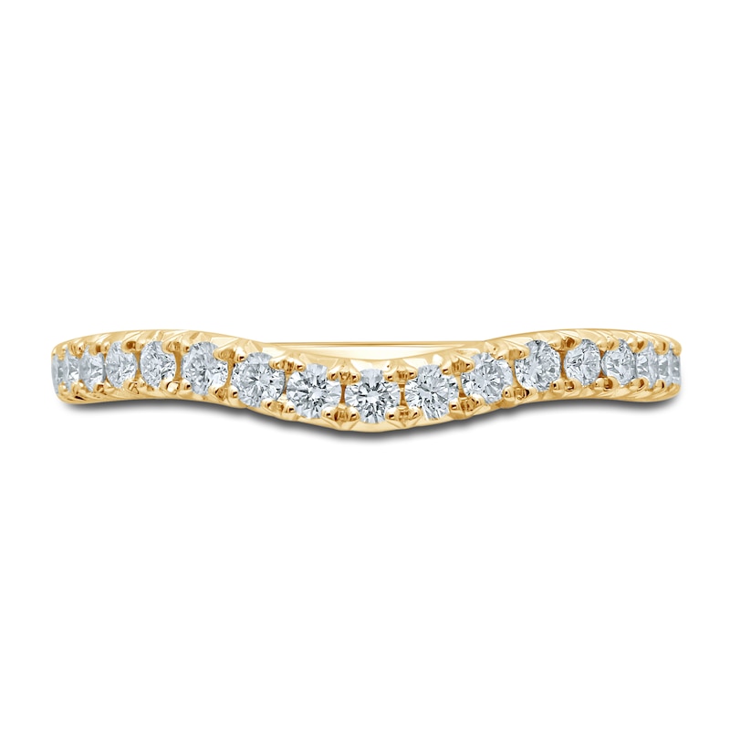 This timeless contoured wedding band features a row of radiant round-cut diamonds framed by milgrain detailing. Styled in splendid 18K yellow gold, the ring has a total diamond weight of 1/3 carat. From the Monique Lhuillier Bliss collection, available exclusively at KAY, which showcases beautifully elevated designs and stunning details for those who appreciate the art of fashion. Please note: This ring is available in limited sizes. If you don't see your size here, please visit a store to order your ring.