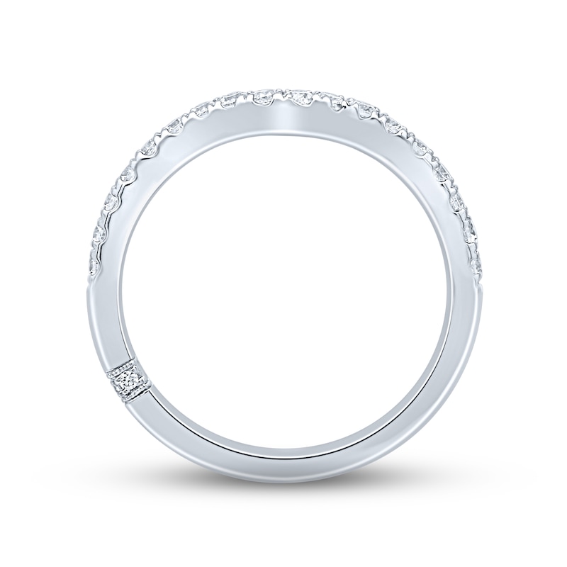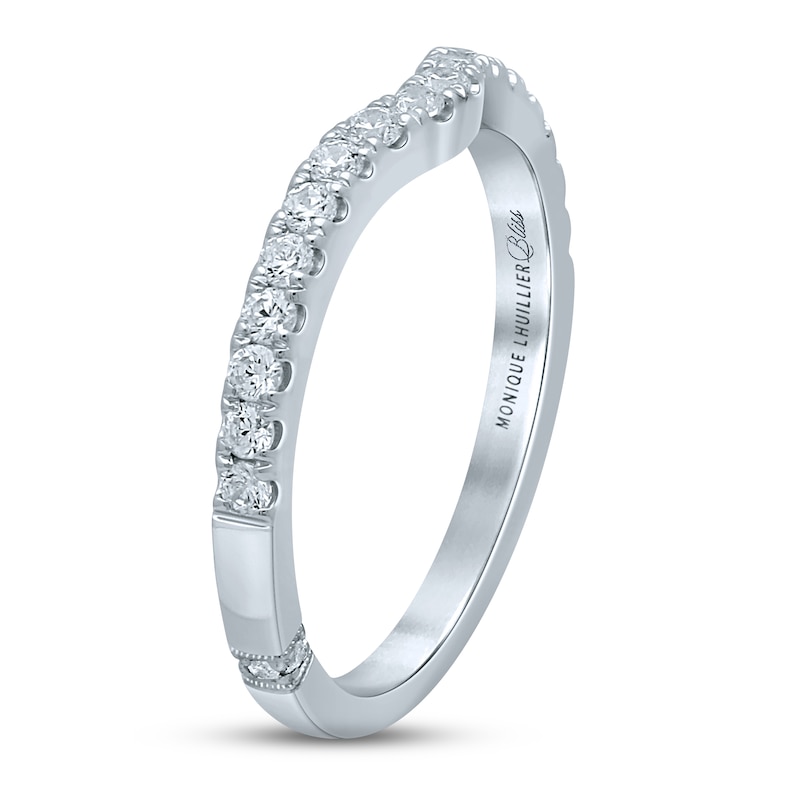 Radiant round diamonds sweep along the curves of this lovely wedding band. Styled in 18K white gold, the ring has a total diamond weight of 3/8 carat and is contoured to fit with her matching engagement ring (sold separately). From the Monique Lhuillier Bliss collection, available exclusively at KAY. Please note: This ring is available in limited sizes. If you don't see your size here, please visit a store to order your ring.