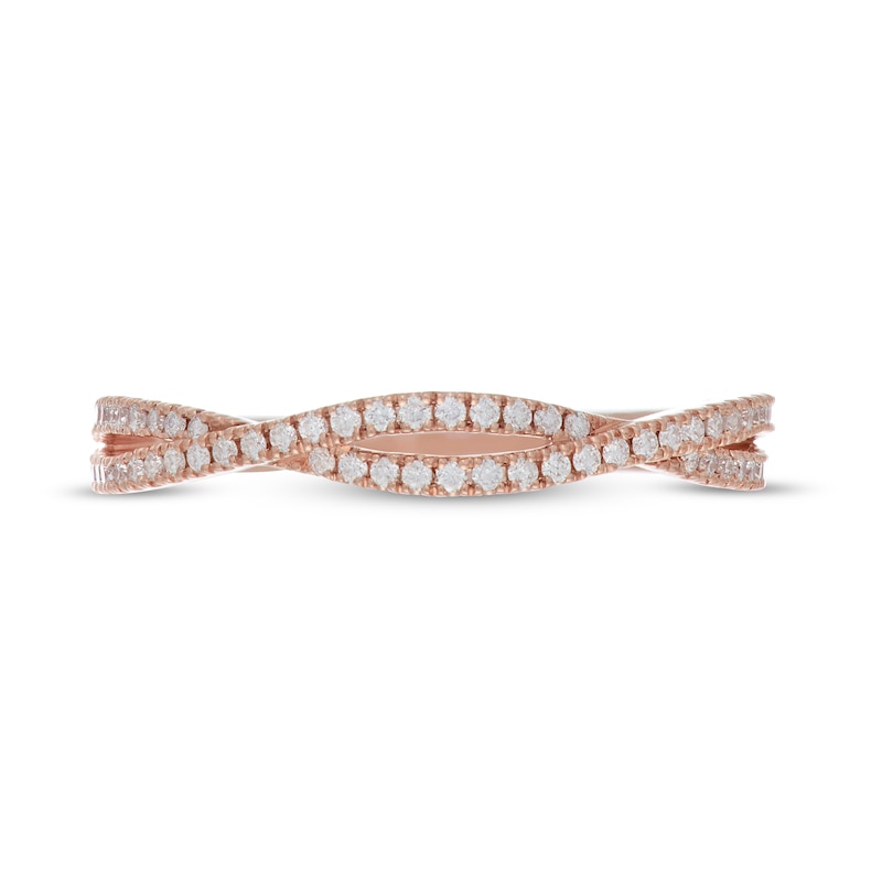 Graceful, sparkling twists of round diamonds form this elegant Neil Lane Bridal® wedding band for her, which is designed to fit alongside the matching engagement ring (sold separately). The ring is crafted of 14K rose gold, and the diamonds total 1/4 carat in weight.
